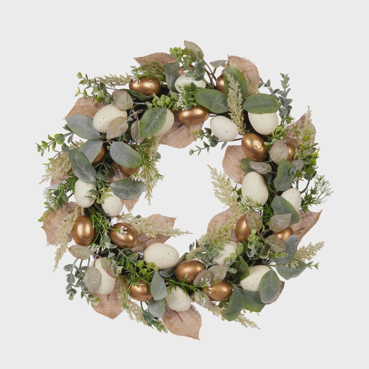 A ring of branches, with golden and white eggs, this a great decorative for easter adding a touch to your front foor or wall.
