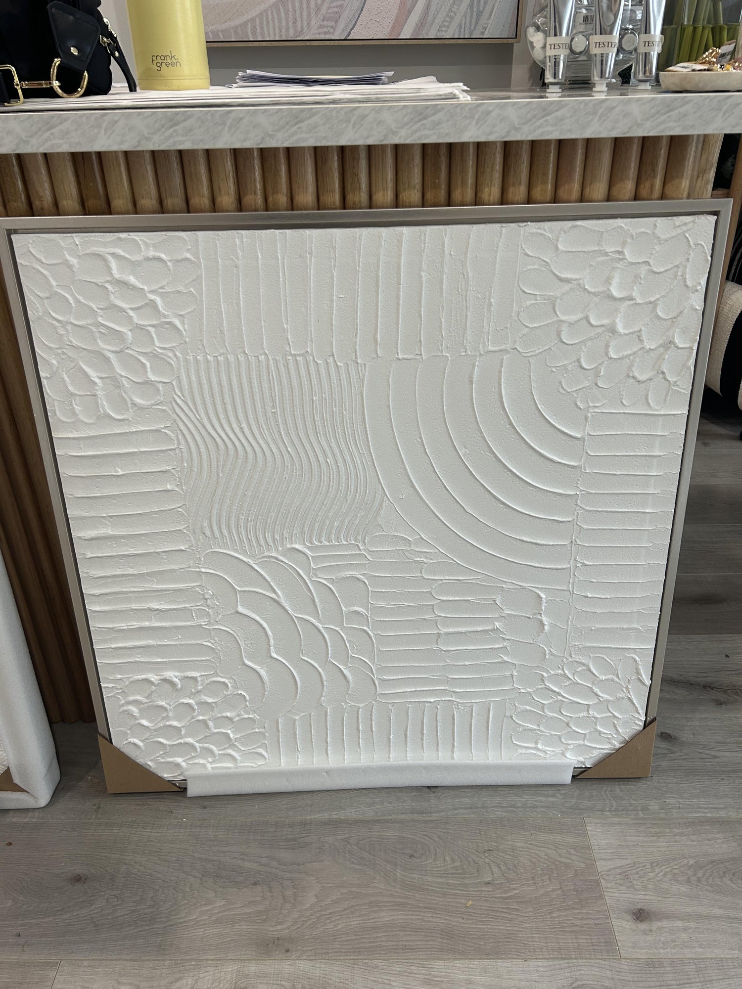 A textured all-white painting is a piece of art that primarily uses varying textures and shades of white to create depth and interest. The artist might employ techniques such as layering thick paint, using different brush strokes. The texture allows light to play across the surface, casting subtle shadows and highlights that give the painting a dynamic and ever-changing appearance. This kind of artwork often evokes a sense of calm and minimalism to your home.