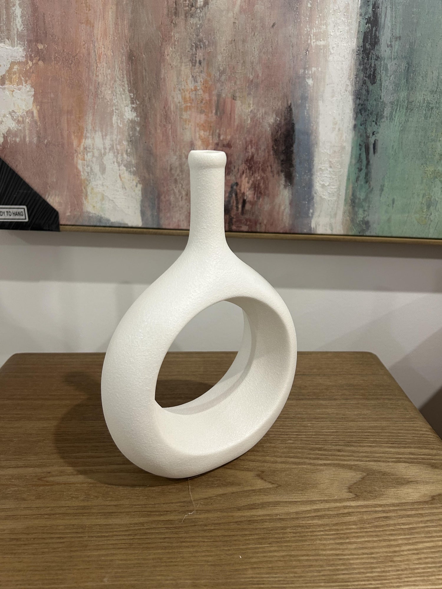 A round statement vase with a hole in the middle is a striking and contemporary piece of decor that captures attention with its unique design. This vase typically features a perfectly round or slightly oval shape with a central cut-out or hole, creating a bold visual focal point. The hole in the middle adds an element of intrigue and modernity, allowing light to pass through and casting interesting shadows. This distinctive design makes it a perfect centerpiece, adding a touch of artistic flair and elegance to any space.